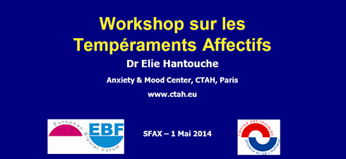 Le Dr Hantouche a animé deux workshops : un sur les « Hypomanies » (lien avec le diaporama) et un autre sur les « Tempéraments Affectifs » (lien avec le diaporama). La première constatation est lʼintérêt des psychiatres tunisiens pour le dépistage et la compréhension du spectre bipolaire, notamment le trouble BP-II et les dépressions associées aux tempéraments bipolaires (cyclothymique et hyperthymique).